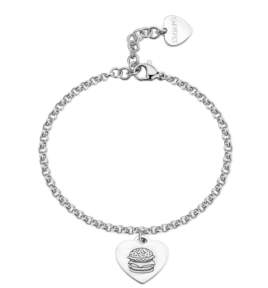 Bracciale in acciaio 316L con pendente a forma di cuore con hamburger in smalto nero su fronte e scritta "Se senti le farfalle nello stomaco è la fame" in smalto nero su retro.