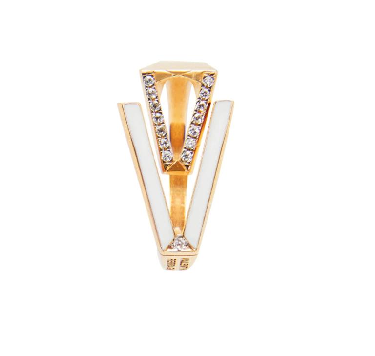 Anello Mia White, in argento 925°%, placcatura oro giallo. Questo anello presenta nella parte superiore un soggetto a forma di V tempestato di pavé di zirconi bianchi e una V più grande con smalto bianco. Tutti i gioielli Valentina Ferragni sono Made in Italy, in argento 925°% placcati in oro 18kt.