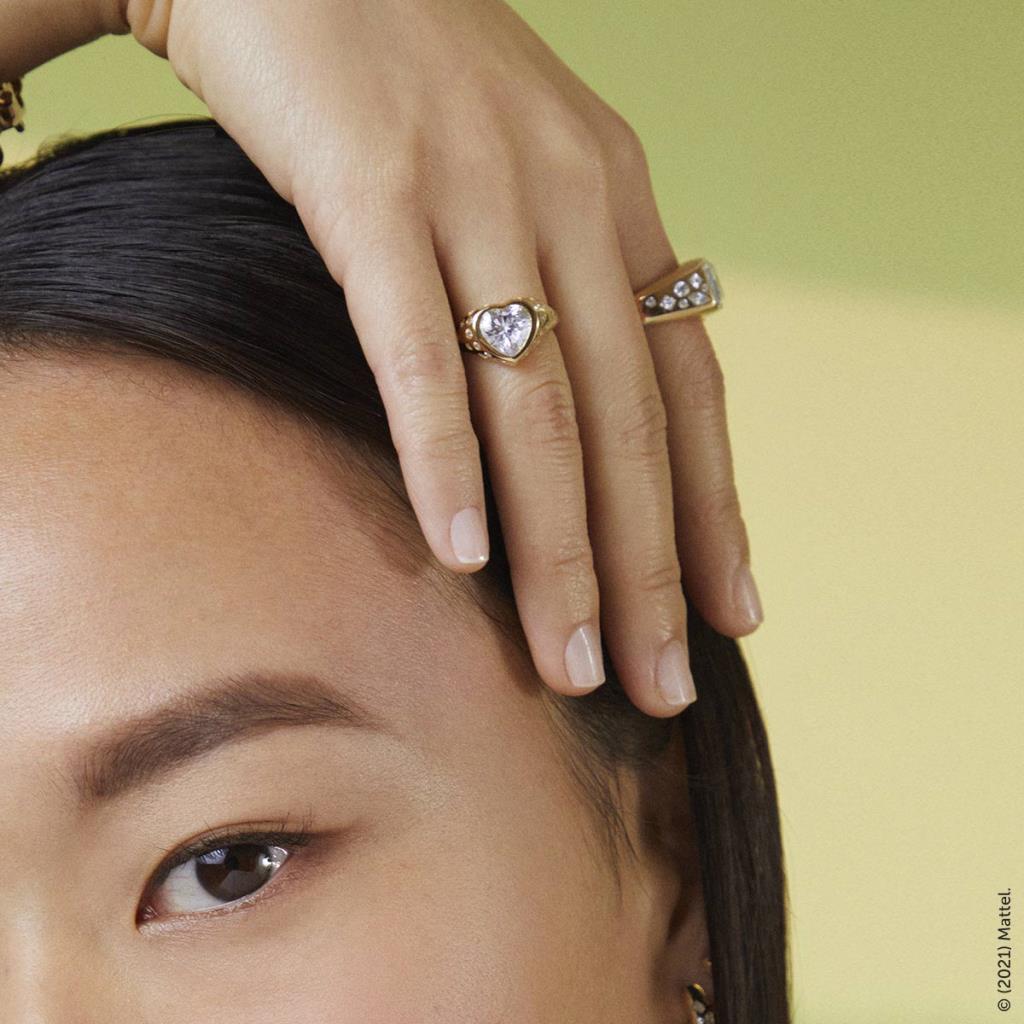 Anello con pietra centrale taglio cuore, in argento bagnato in oro 18 kt intervallato da luminose pietre cubic zirconia bianco con tagli e sfaccettature diverse.Abbiamo incontrato la bambola più famosa di sempre e avuto l’onore di trasformare i suoi gioielli in una collezione speciale da indossare.Rue des Mille x BarbieJust As You Are , Così come seiMateriale: Argento 925, cubic zirconia tagli variFinitura disponibile: galvanica oro giallo 18 ktLunghezza: taglia unica, diametro 1,5cm. L'anello è aperto e si può quindi regolare la misura maneggiandolo con delicatezza.Nichel freeFatto in Italia, con amore