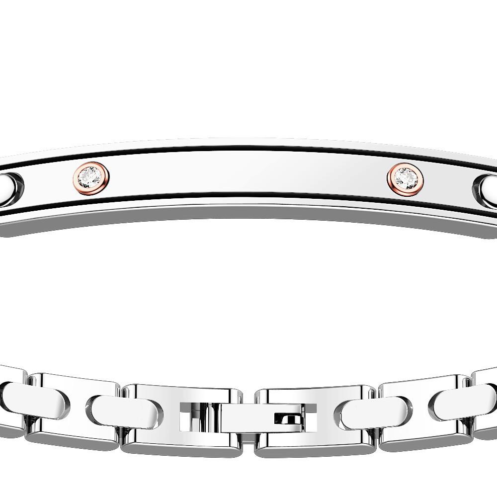 Bracciale da uomo con maglie quadrate ad inserti ovali in acciaio.Placca con incisioni parallele e due bottoni laterali color oro rosa che montano zaffiri bianchi incastonati.Elegante e splendente, completa incredibilmente il tuo stile curato.