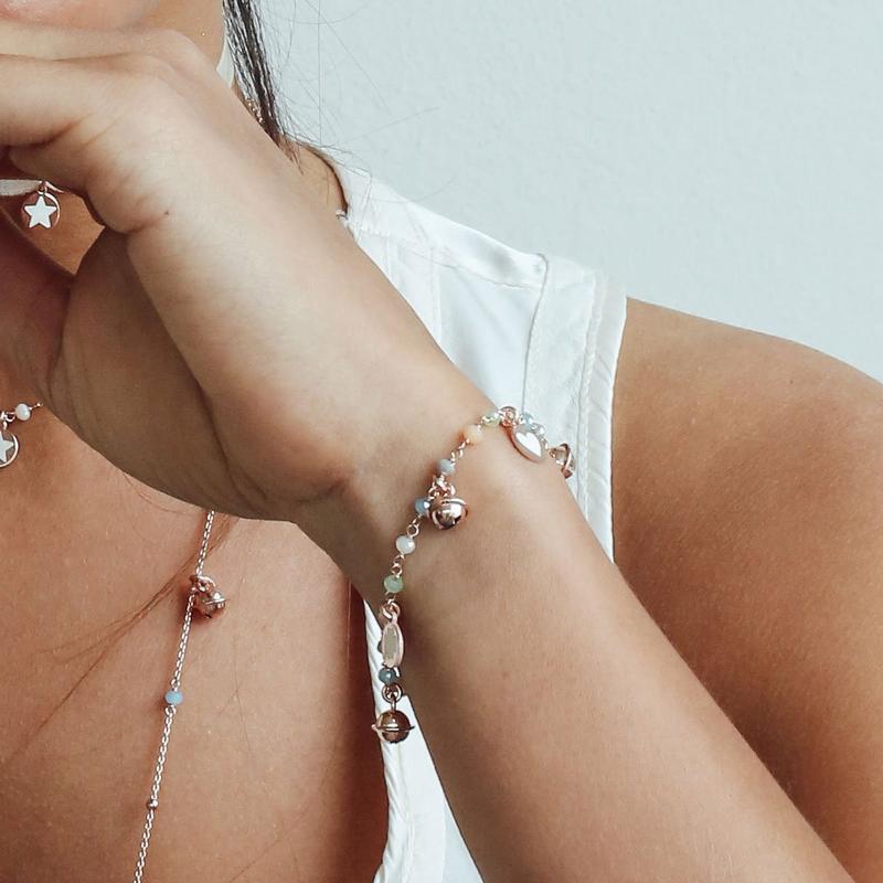 Braccialetto incatenato pietre miste pastello, 3 medagliette e 4 campanelliniArgento 925%, galvanica oro rosa.