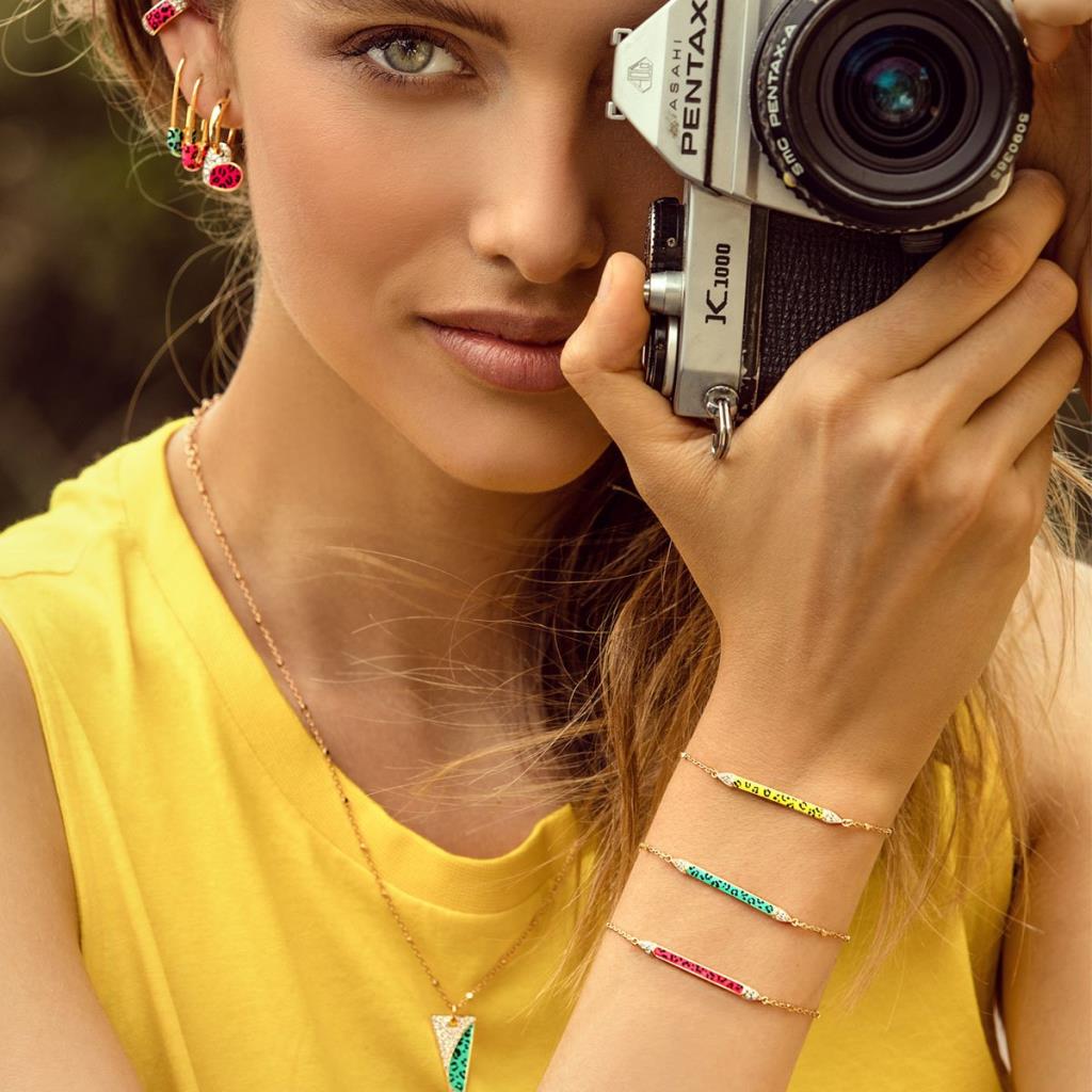 Braccialetto con barretta centrale smaltata e zirconi lateraliSmalto fluo in 3 colori maculato a mano Argento 925, Galvanica oro giallo 18Kt Lunghezza bracciale 17 cm + 3 cm di estensione regolabile