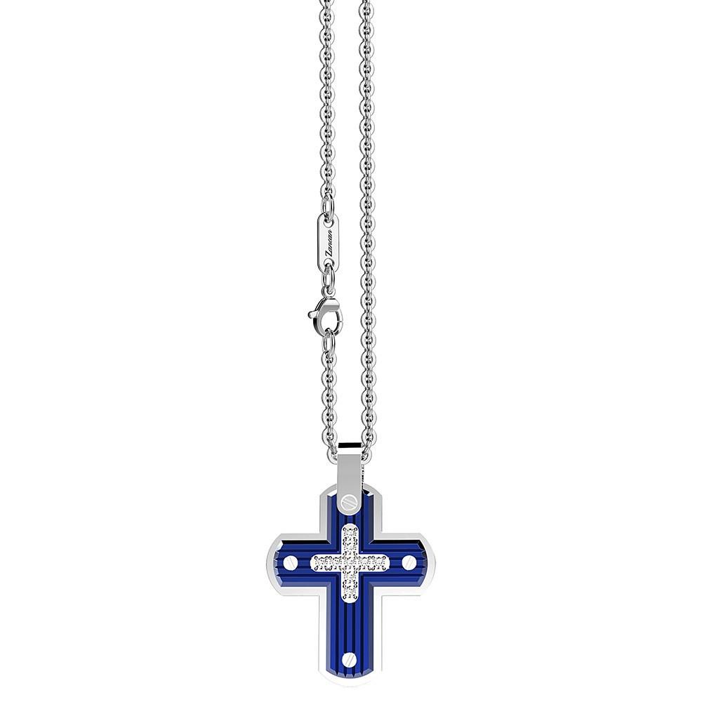 Collana in acciaio con pendaglio a croce blu dalla superficie a scanalature e zaffiri bianchi al centro e viti ai lati.La croce è contornata da acciaio lucido, chiusura con moschettone.Design originale e particolare, per dimostrare il tuo lato innovativo e tecnico.Questo prodotto appartiene alla collezione Hiteck.Collana in acciaio e zaffiri bianchi.Collana in acciaio 316-L medicale.Zaffiri bianchi.Trattamento in PVD blu.Misura standard 50 cm.