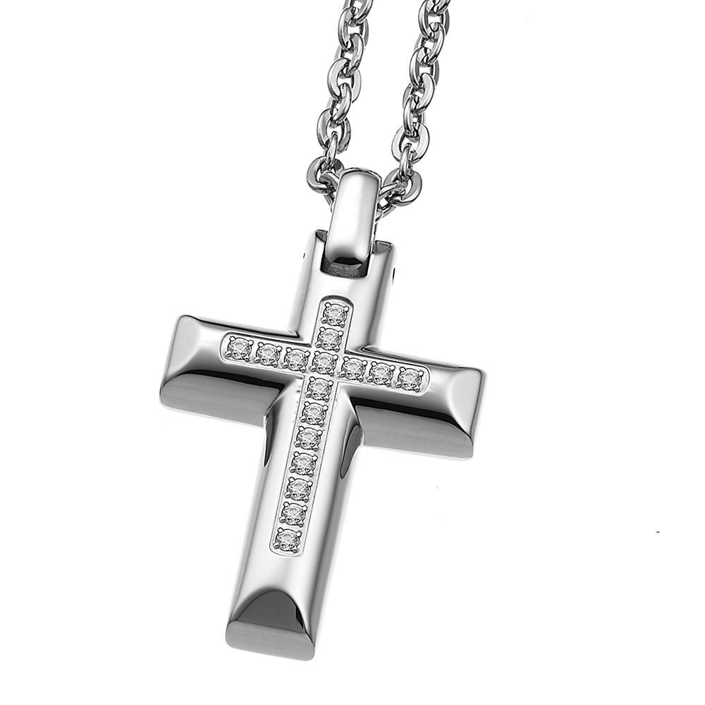 Collana in acciaio con croce pendente e zaffiri bianchi incastonati che ne esaltano la forma.Collana raffinata dal design classico, si adatta benissimo ad un spirito giovane, il regalo perfetto per l'uomo contemporaneo.