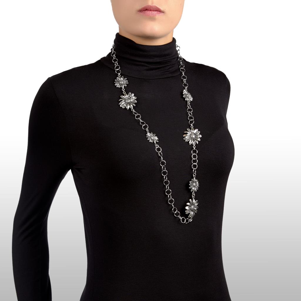 Collana in Argento 925Lunghezza 85 cm.Collezione Margherite - Fiori sinceri che scaldano il cuore. È la nostra primavera da indossare, orizzonte di petali d'argento e storie semplici nel verde infinito.Peso: 68 gr.Lunghezza regolabile con chiusura a moschettone. Fatto a mano in Italia.