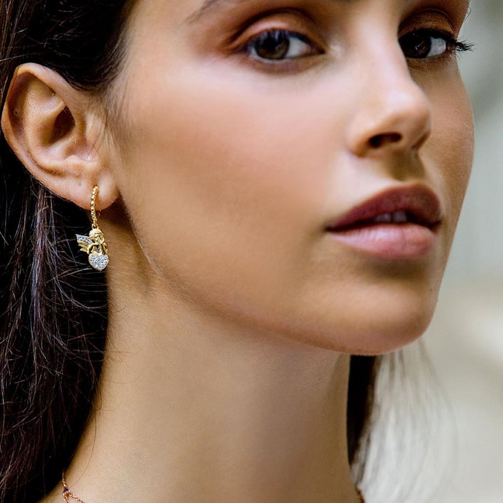 Orecchino singolo con cerchio e soggetto angioletto con zirconi bianchiSoggetto: Angioletto Finitura disponibile: Placcatura oro rosa 18kt o placcatura oro giallo 18kt Materiale: Argento 925 Diametro: 1 cm