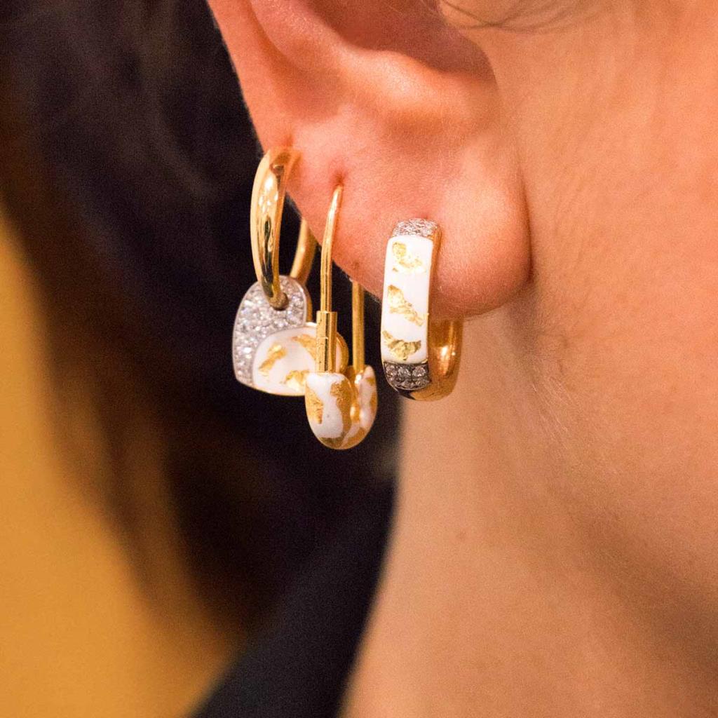 Orecchino singolo spilla, smalto bianco e foglia d'oro. La smaltatura viene fatta a mano con tre passaggi : una smaltatura di colore, una foglia d'oro 18kt e un ultimo passaggio di smalto trasparenteArgento 925, Galvanica oro giallo 18KtAltezza orecchino 2,5 cm