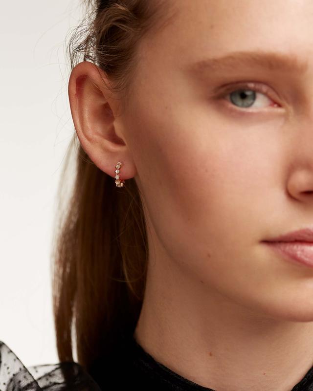 MATERIALE: Argento Sterling 925 FINITURA: Placcatura in Oro 18k PIETRE: Base in Madreperla e cristalli bianchi DIAMETRO DEL CERCHIO: 7 mmSistema di chiusura: Vite tradizionale Peso: 1.4 g*La tonalità delle pietre semipreziose potrebbe variare leggermente a causa della loro origine naturale