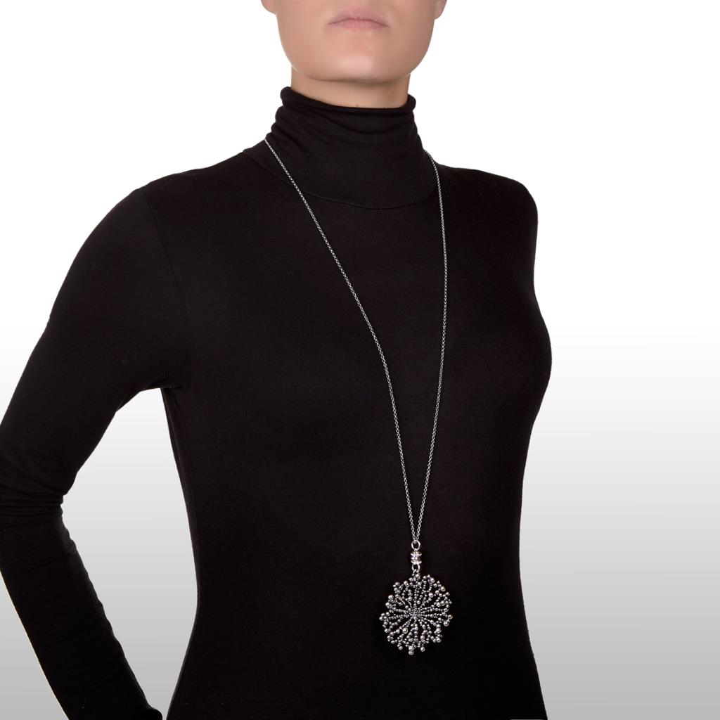 Pendente in Argento 925Lunghezza catena 90 cm. Collezione Perlage - Dall'ispirazione delle bollicine di champagne, un flusso di sferette che si rincorrono nel flute, creando giochi e forme, come nella più romantica delle notti d’estate.Peso: 40 gr.Diametro decoro 6,5 cm. Chiusura a moschettone.Fatto a mano in Italia.