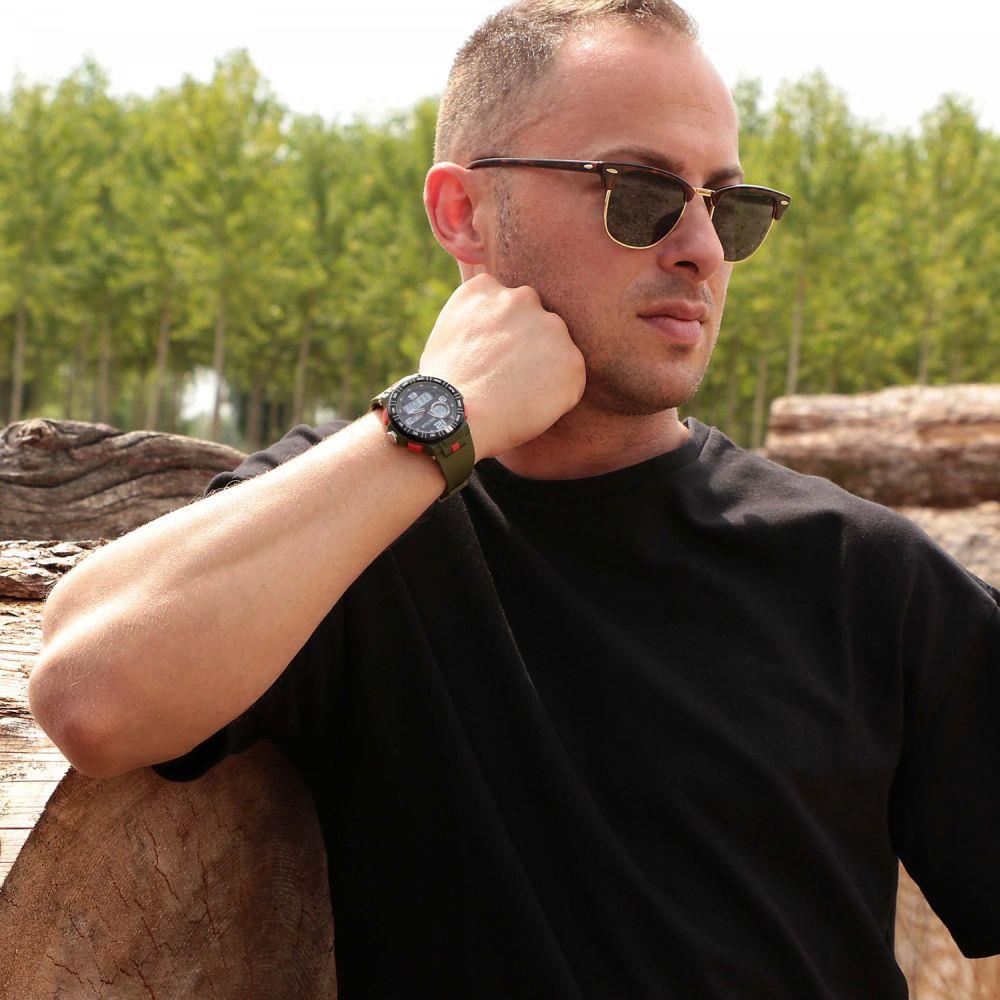 Collezione ex-28Dimensione cassa 52.3x46mmMateriale e finitura cassa Pu, AbsColore quadrante NeroColore cinturino VerdeWater resistant 5 ATMSpessore cassa 15.70Genere UomoFibbia Fibbia ardiglioneGaranzia Ufficiale 2 anni SectorSector experience Digital